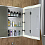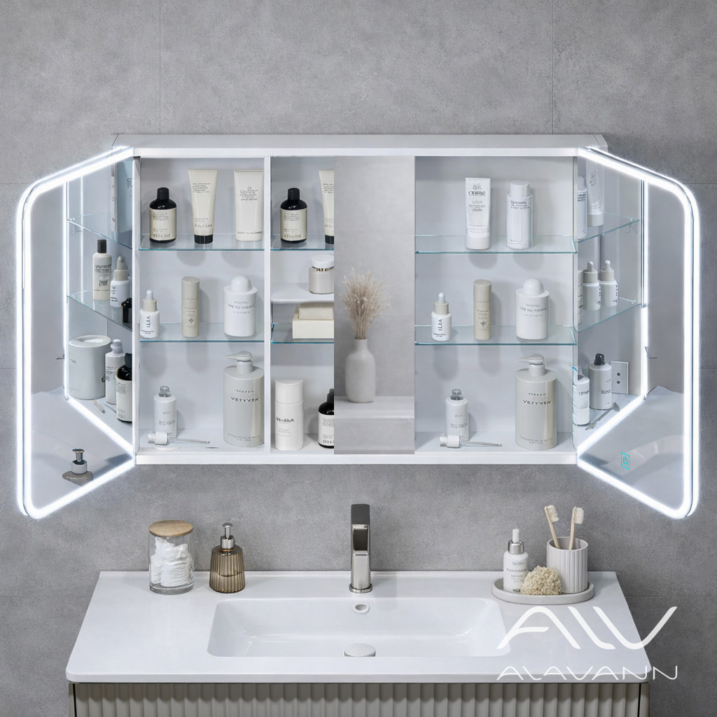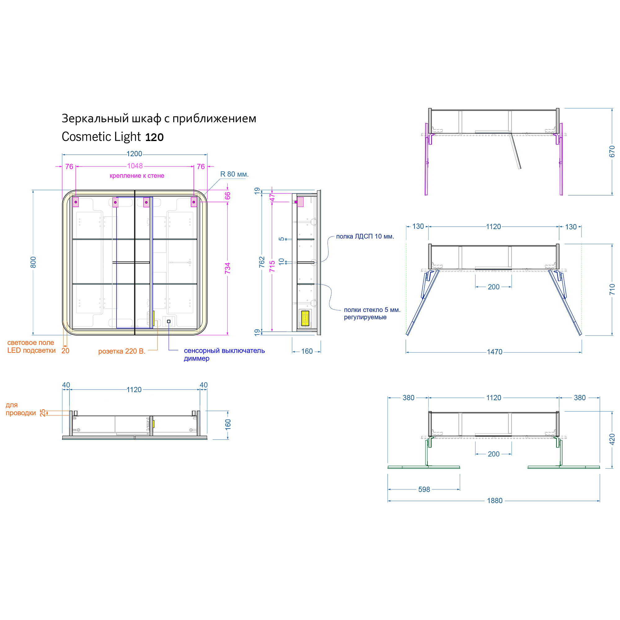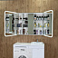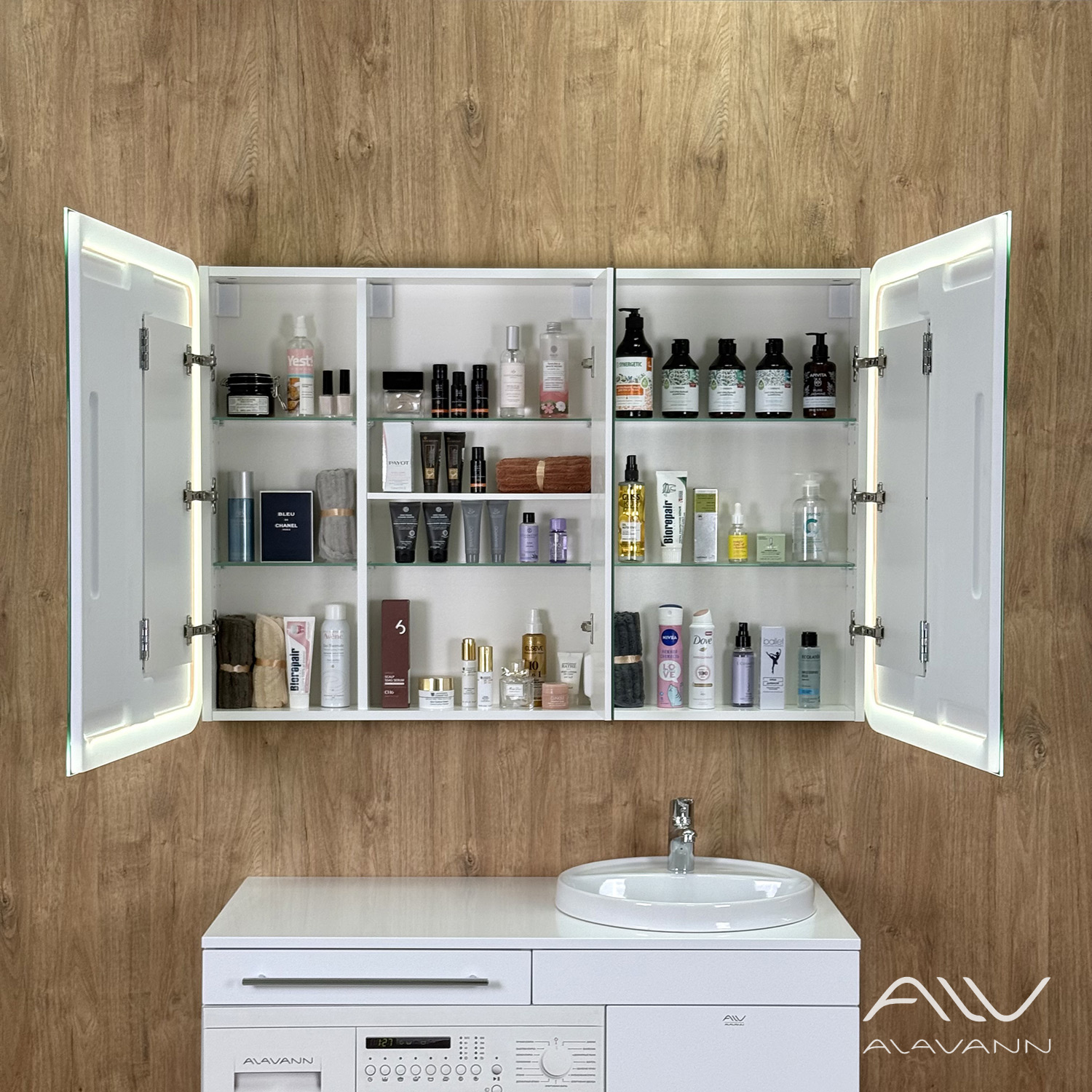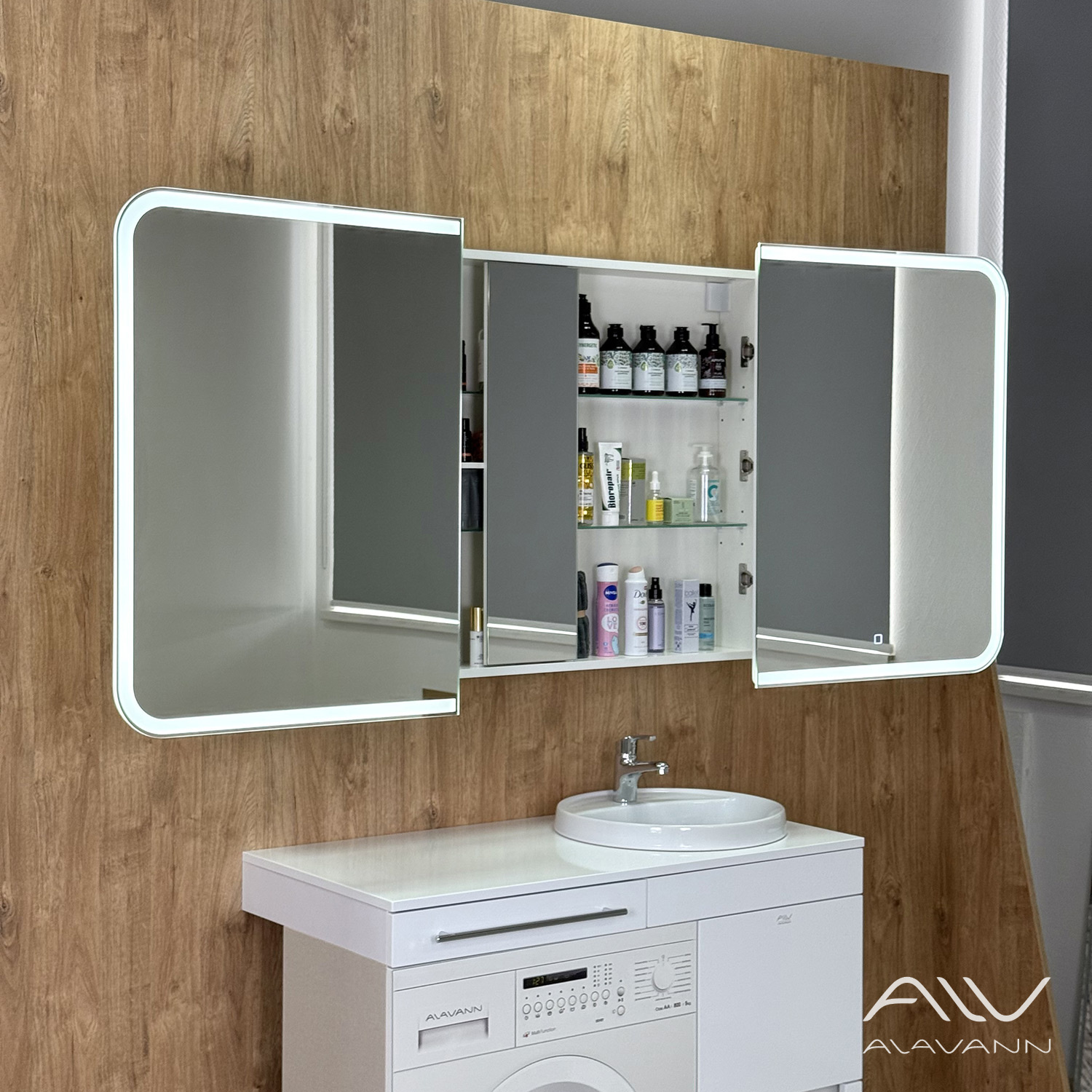 Зеркальный шкаф Косметик Лайт 120 — функциональное решение для просторной ванной комнаты. Модель оснащена системой приближения и тремя зеркальными фасадами: двумя наружными радиусными с подсветкой и одним внутренним. При открывании фасады формируют удобное «трюмо», обеспечивая максимальный обзор.