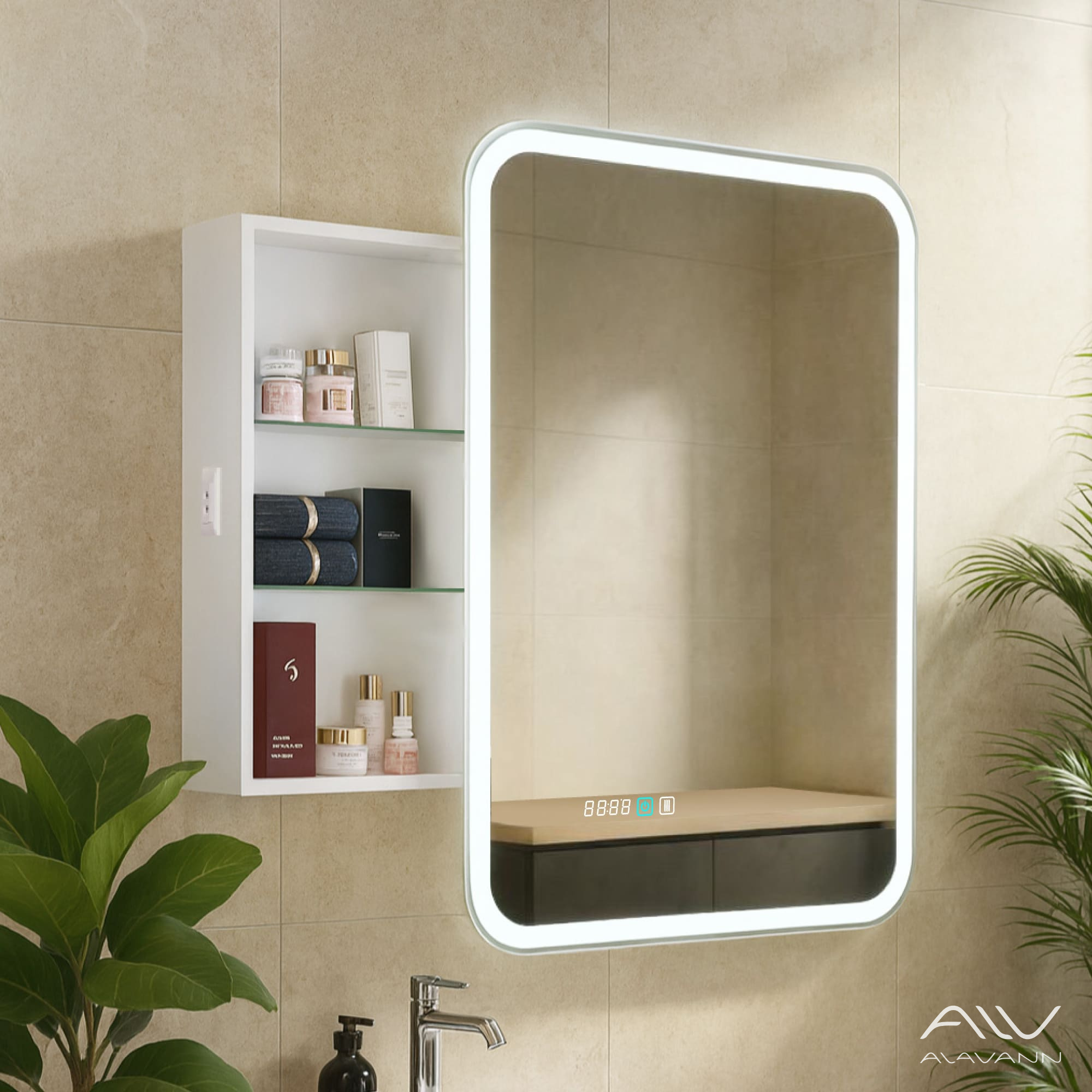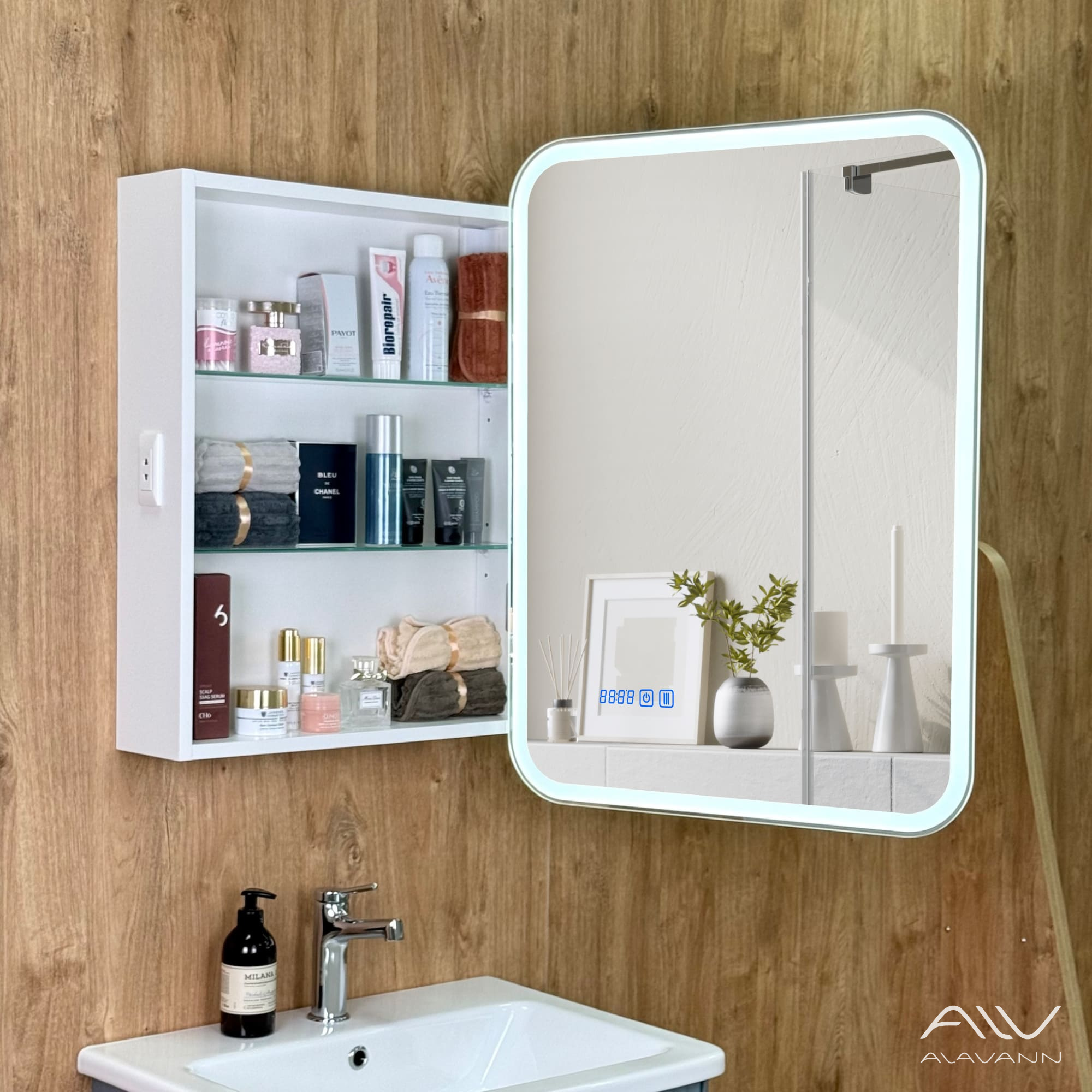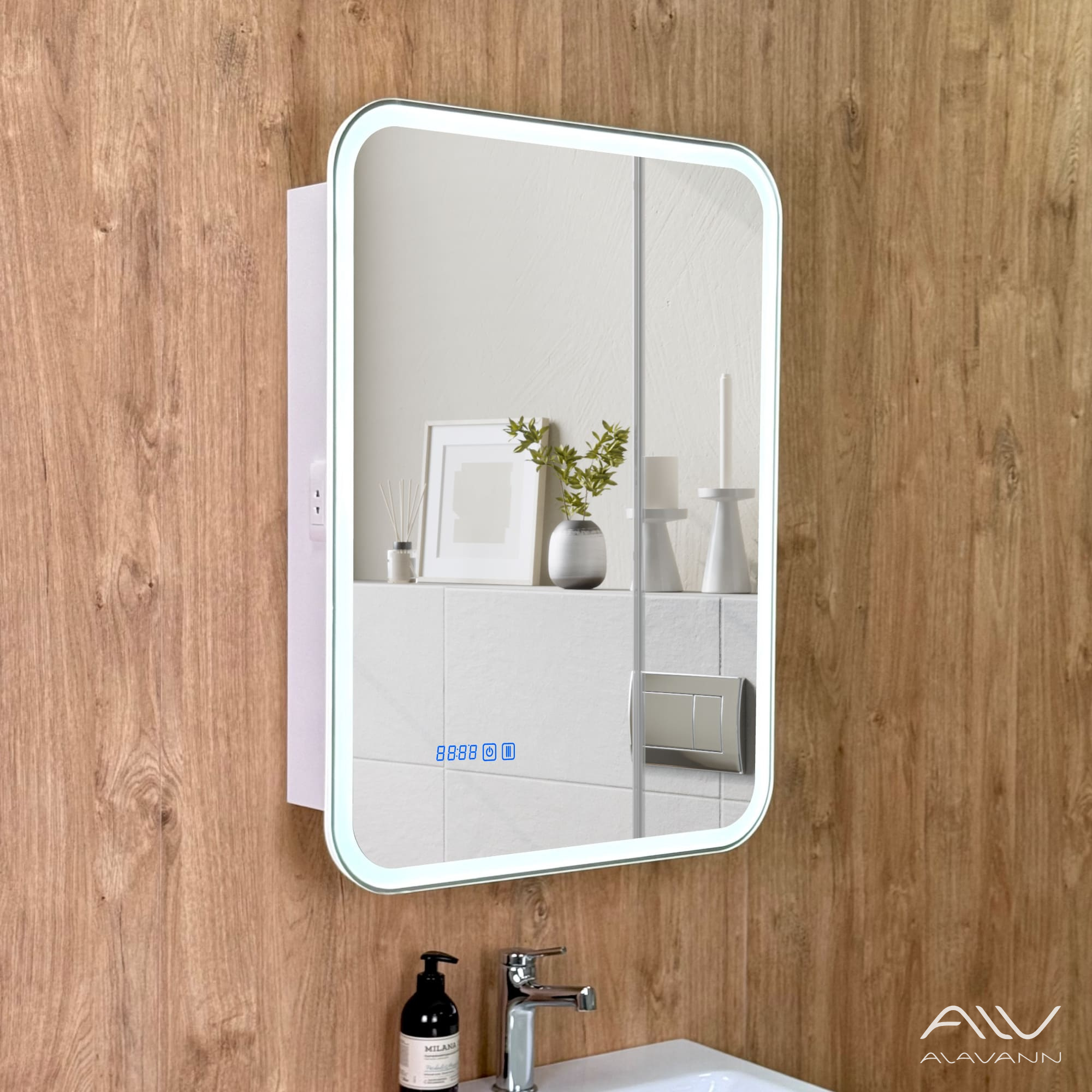 - Зеркало-шкаф с подсветкой в ванную комнатуоснащен часами со сменой цветовой температуры (3 режима: нейтральный, холодный и тёплый).