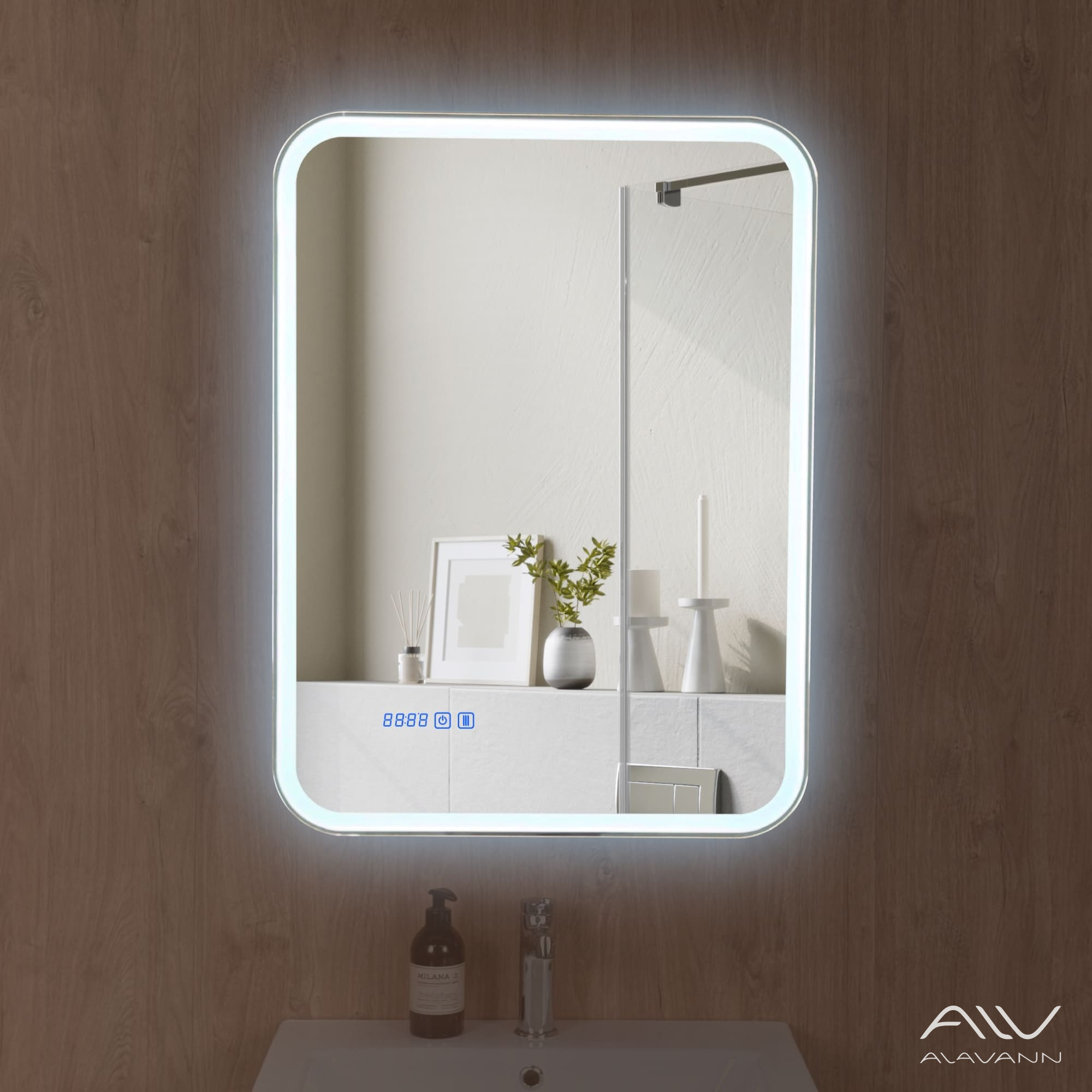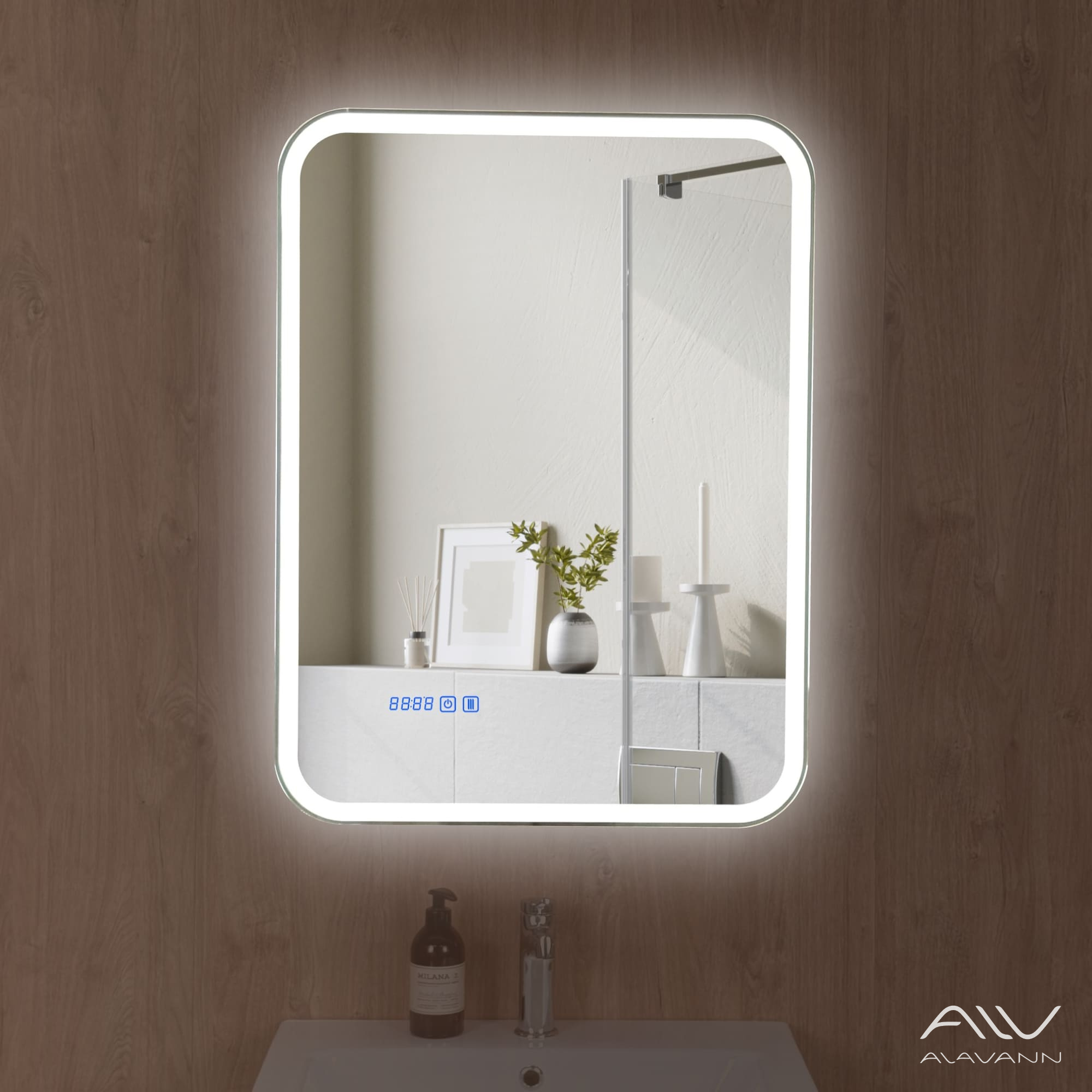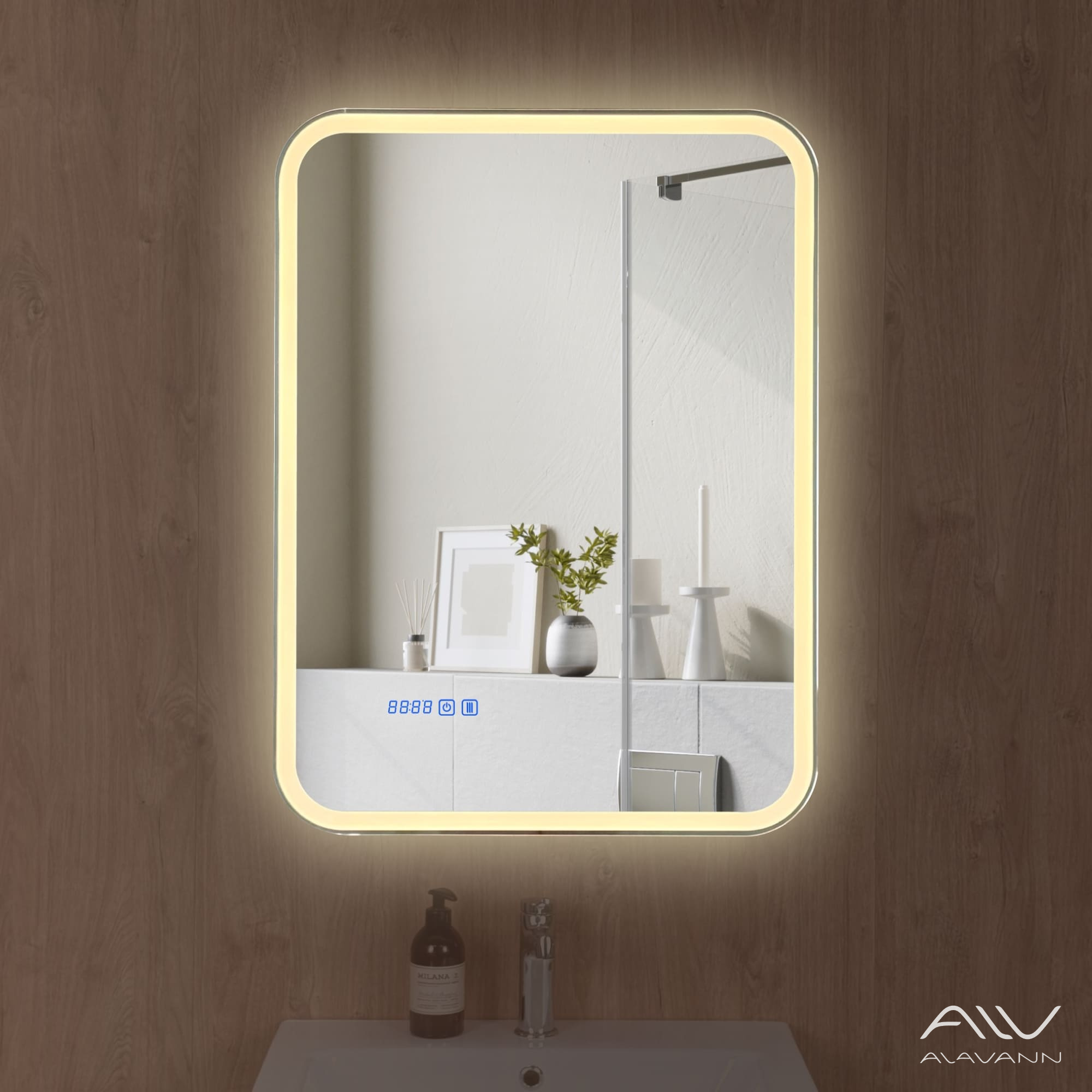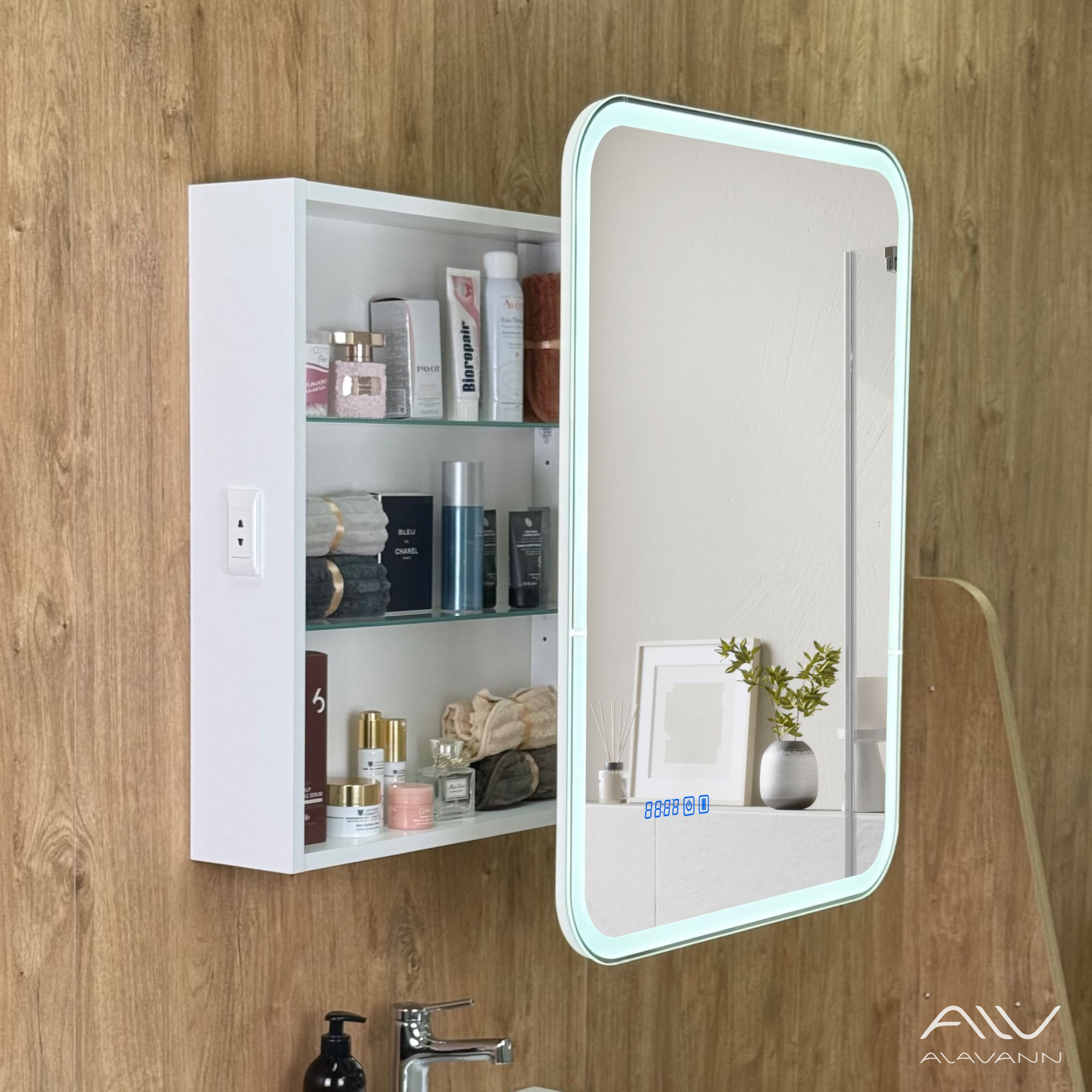 - Зеркало-шкаф с подсветкой в ванную комнатуоснащен часами со сменой цветовой температуры (3 режима: нейтральный, холодный и тёплый).