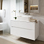 Два вместительных выдвижных ящика тумбы в ванную Стелла (ширина 80) на направляющих с доводчиками фирмы Hettich оформлены фирменным материалом «интерьерный лен». Внутри ящики оборудованы переставными делителями для комфортной организации хранения необходимых принадлежностей.