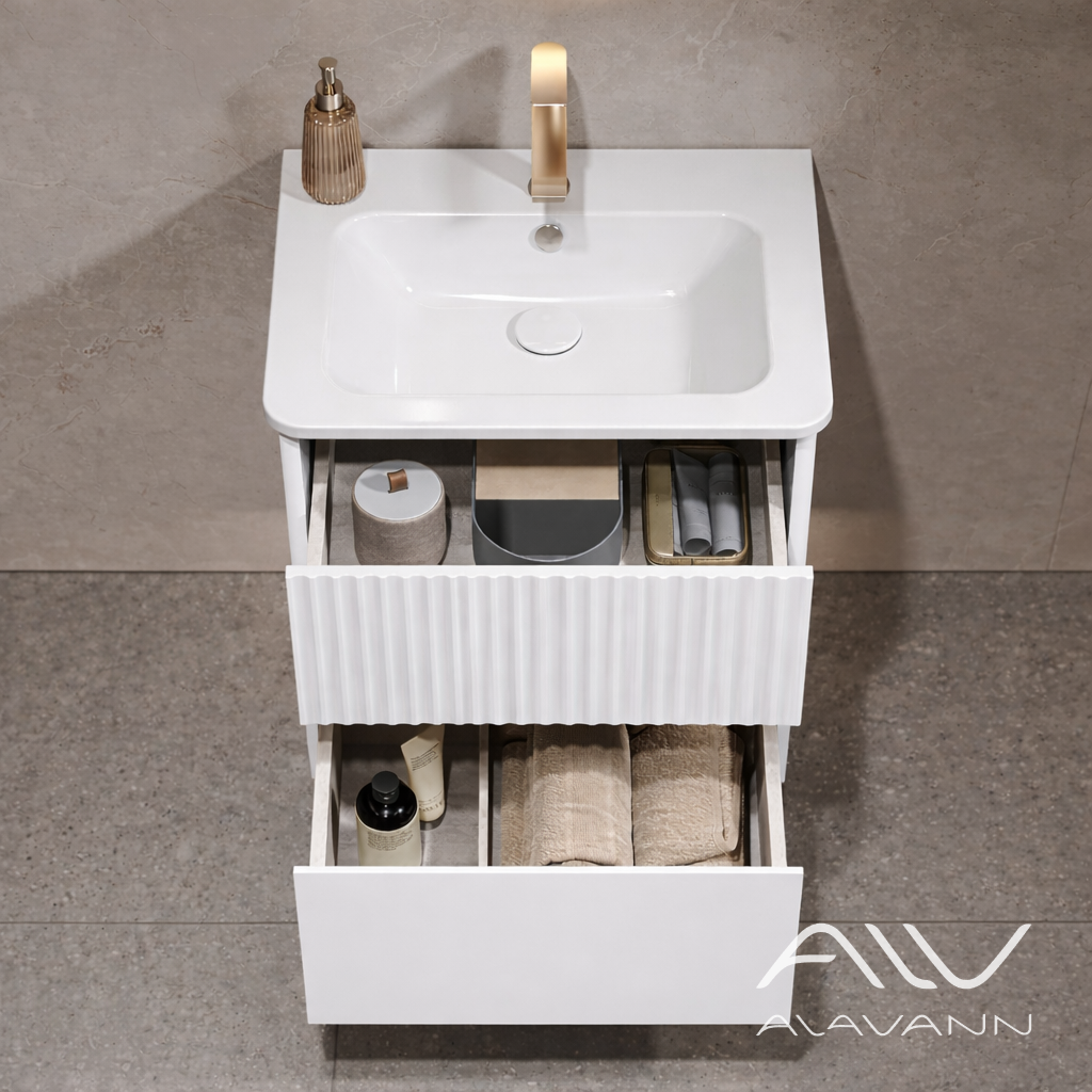 Название «Вейв» передает главную особенность дизайна – наличие декоративной фрезерованной волны на лицевой стороне верхнего выдвижного ящика. Нижний ящик – гладкий. Для более комфортного открывания предусмотрен удобный зацеп и система направляющих полного выдвижения. Обратный ход ящиков обеспечивается встроенными доводчиками. Раковина выполнена из керамики Никсон 60, Турция.