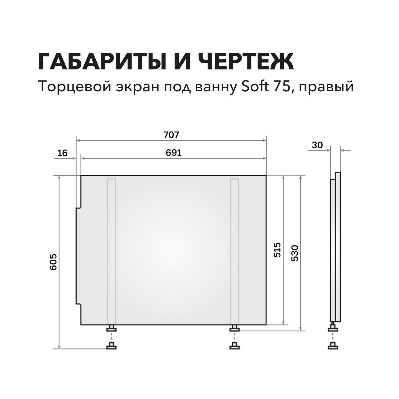 Торцевой экран под ванну из МДФ Soft 75 см, правый — практичное и эстетичное решение для аккуратного оформления боковой части ванны. Размер изделия составляет 707 × 515 × 30 мм без опор и 707 × 530 (60.5) × 30 мм с регулируемыми опорами, что позволяет точно подогнать высоту при установке. Экран выполнен из ламинированной плиты МДФ толщиной 16 мм и покрыт глянцевой эмалью в универсальном белом цвете, устойчивом к влаге.