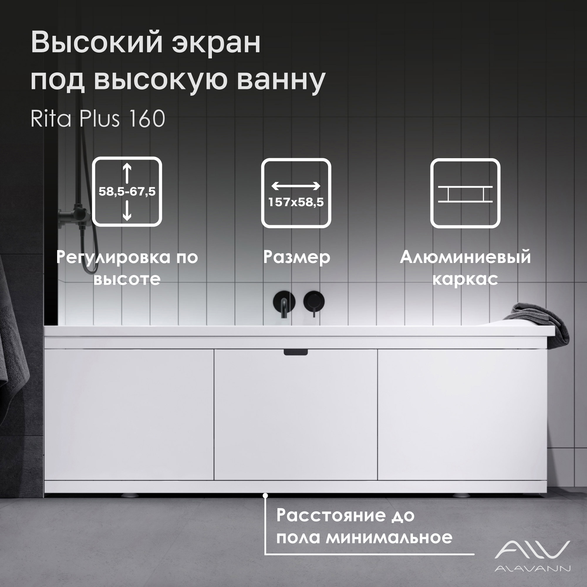 Экран под ванну МДФ Рита Плюс (Rita Plus) 160 белый — это универсальное решение от бренда Alavann, предназначенное для облицовки высоких ванн. Конструкция создана на основе алюминиевого профиля и плит МДФ, что гарантирует надежность и удобство монтажа. В комплект включены регулируемые ножки и крепежные болты для устойчивой фиксации.