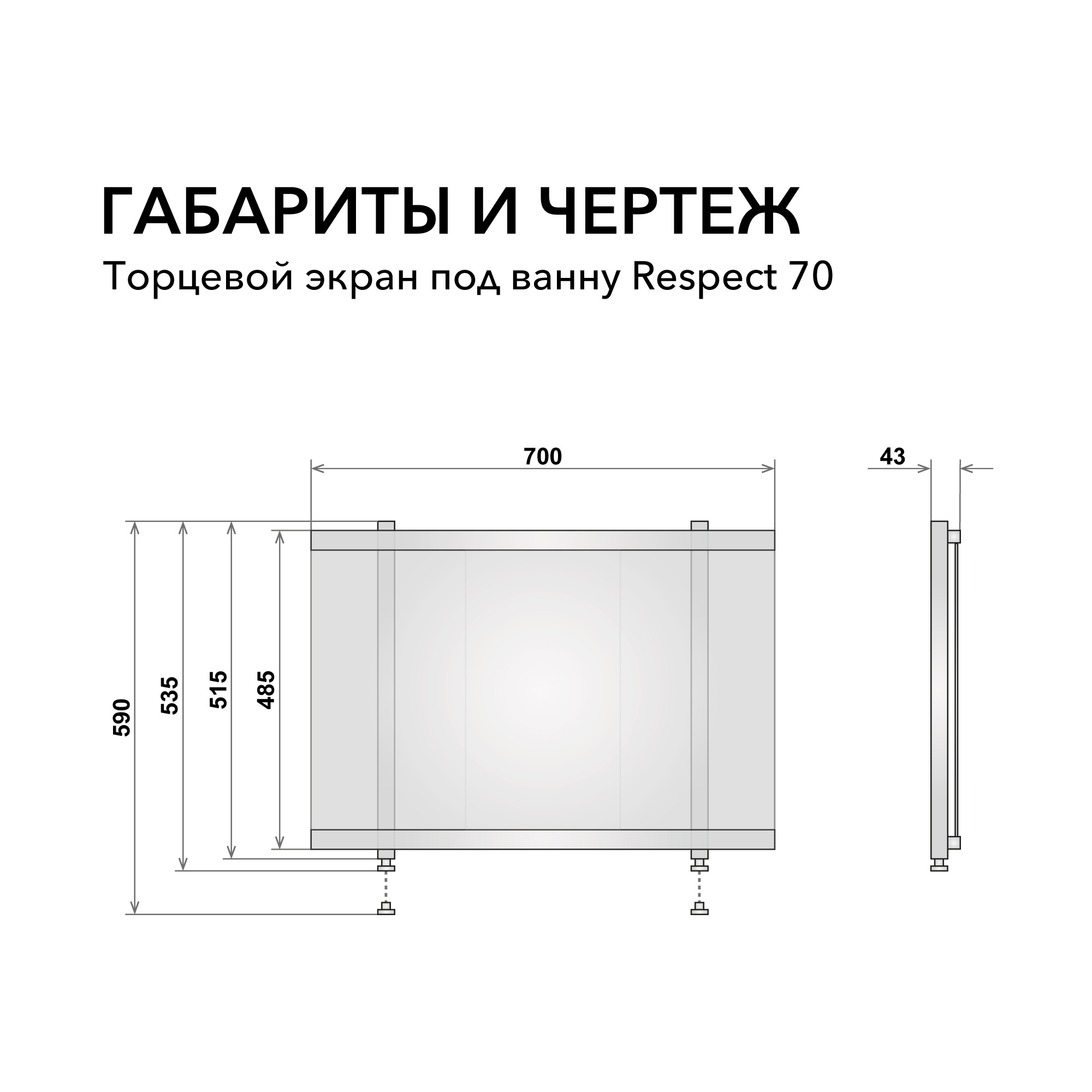 Торцевой экран под ванну Respect 70 см в белом цвете — практичное решение для аккуратного оформления боковой части ванны. Фасад выполнен из прочных ПВХ-панелей толщиной 5 мм и дополнен С-образным белым профилем, что обеспечивает аккуратный внешний вид и устойчивость к влаге.